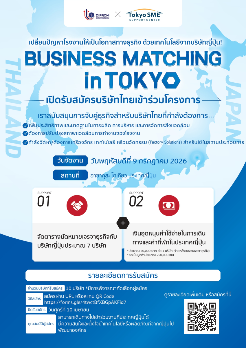 ขอเรียนเชิญท่านเข้าร่วมกิจกรรมเจรจาจับคู่ธุรกิจ “Thailand - Japan Business Matching Event in Tokyo 2026" ในธีม Factory Solutions ที่จะจัดขึ้นแบบ On-site
