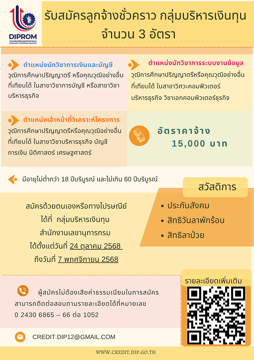 กรณีสมัครทางไปรษณีย์ ผู้ที่ประสงค์จะสมัครสอบสามารถยื่นในสมัคร พร้อมเอกสารและหลักฐานที่ใช้ในการสมัครผ่านทางไปรษณีย์ด่วนพิเศษ (EMS) โดยจ่าหน้าซองถึง กลุ่มบริหารเงินทุน สำนักงานเลขานุการกรม กรมส่งเสริมอุตสาหกรรม ชั้น 4 ถนนพระรามที่ 6 แขวงทุ่งพญาไท เขตราชเทวีกรุงเทพมหานคร 10400 วงเล็บมุมชองจดหมายด้านล่างขวาว่า "สมัครลูกจ้างชั่วคราว" โดยไปรษณีย์ต้องประทับตรารับจดหมายภายในวันที่ปิดรับสมัคร (7 พฤศจิกายน 2568) และให้ถือวันที่ไปรษณีย์ประทับตรารับจดหมายเป็นวันยื่นใบสมัคร ทั้งนี้ ใบสมัครต้องส่งถึงกลุ่มบริหารเงินทุน ภายในวันที่ 14 พฤศจิกายน 2568 ในเวลาราชการ (เวลา 16.30 น.) หากเกินกำหนดเวลาจะไม่ได้รับการพิจารณา